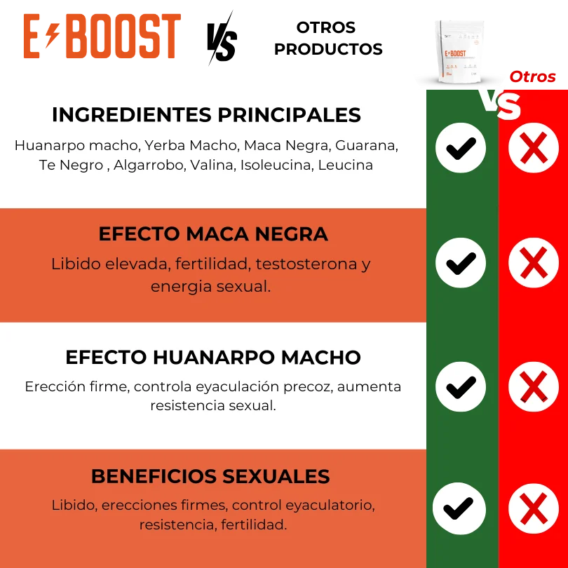 E-BOOST contiene ingredientes tradicionales como maca negra y huanarpo macho, conocidos por apoyar el rendimiento físico y la vitalidad masculina.