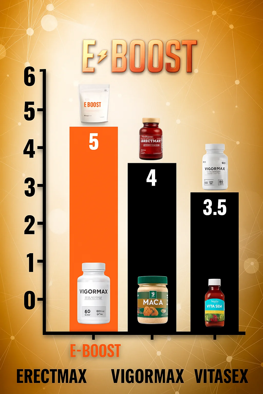E-BOOST es 100 % natural y libre de químicos o estimulantes sintéticos. No causa dependencia, insomnio ni efectos secundarios. Puedes tomarlo a diario sin problemas: 1 sobre disuelto en agua (200 ml), preferiblemente 30 minutos antes de la actividad sexual o al comenzar el día.